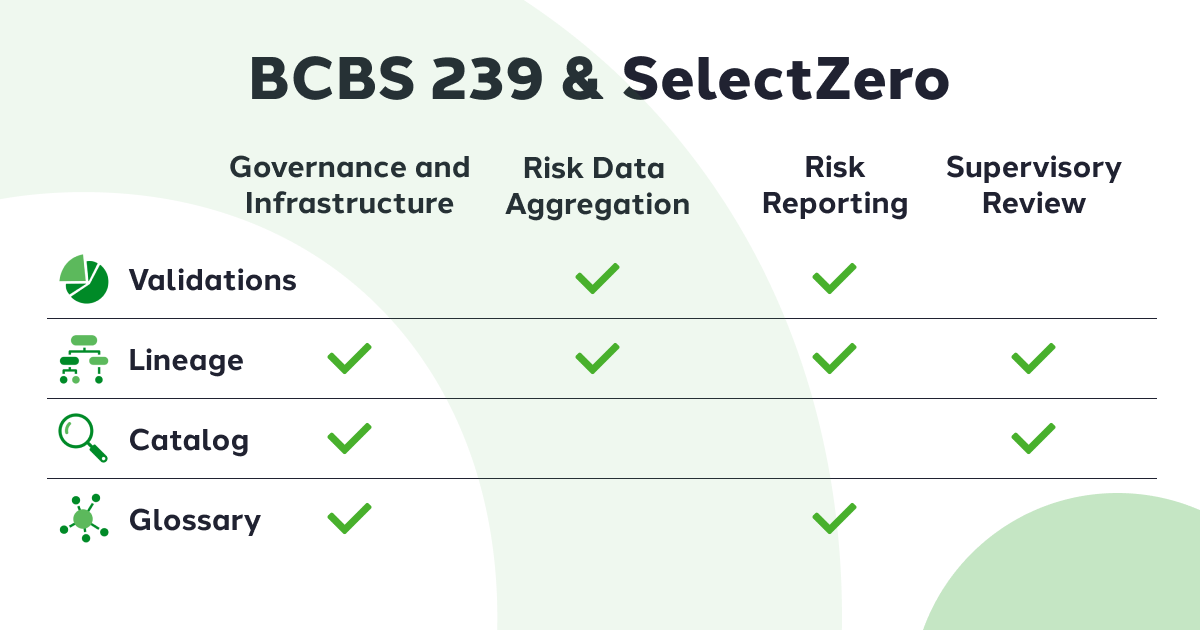SelectZero is a data observability platform built to maintain data quality, data integrity, and regulatory readiness. The platform is designed to support compliance with BCBS 239 by helping financial institutions meet key requirements for risk data aggregation and reporting.