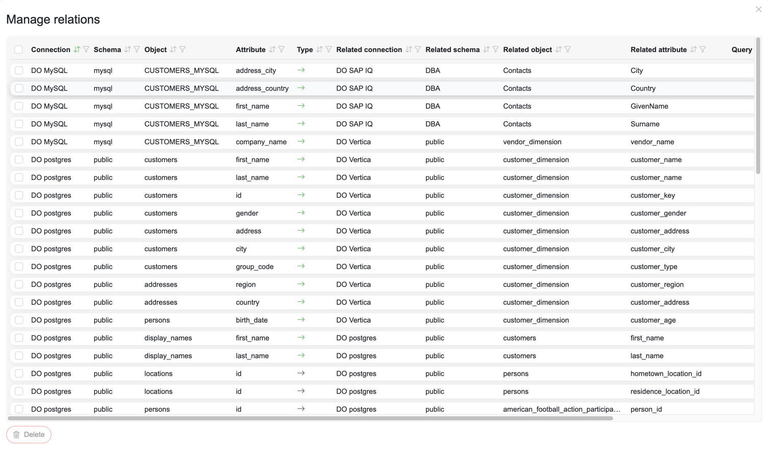 A detailed table view allows users to visually explore and manage column relations. Users can select specific columns and define custom relations between them, specifying the source, connection, schema, and target object.