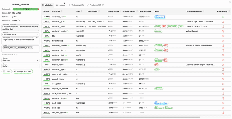 The Catalog Object view has been redesigned for greater clarity and efficiency. Dedicated tabs for Attributes, Lineage, Test Cases, and Profilings make it easier to explore, manage, and monitor each object’s metadata and quality in one structured view.