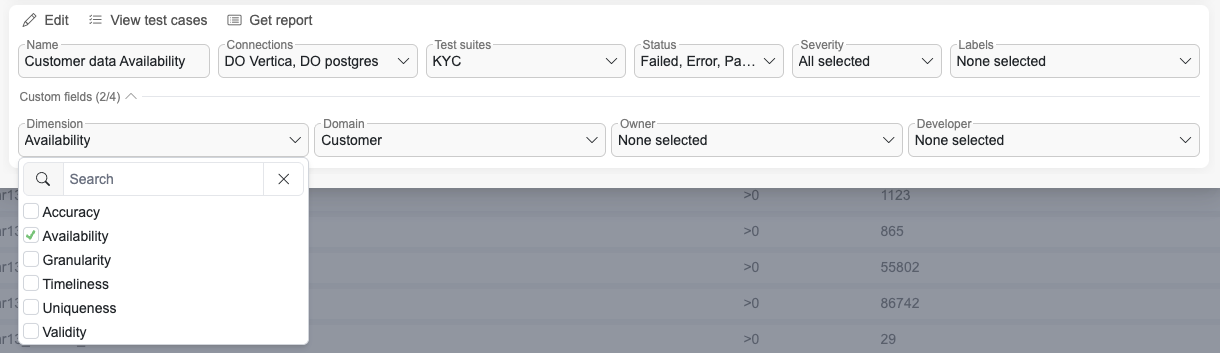 Reports now support filtering by Test Case custom fields, enabling faster and easier analysis of data quality results. This enhancement allows users to create custom data quality metrics, such as Availability, Uniqueness, or Accuracy. Combined with Personalised Dashboards, teams can now easily showcase targeted data quality insights to stakeholders.
