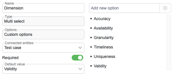Custom fields now support a Required attribute, ensuring key information is always provided when creating or editing entities such as Test Cases, Catalog Attributes, or Terms. Additionally, default values can be defined to prefill fields during entity creation, streamlining data entry and improving consistency across the platform.