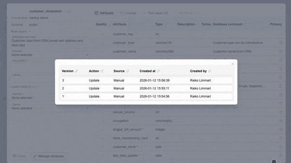 The platform now keeps a full change history for individual Glossary terms, catalog objects, and attributes. All updates are retained, making it easy to review what changed, when, and by whom, and to revert unwanted changes when needed.