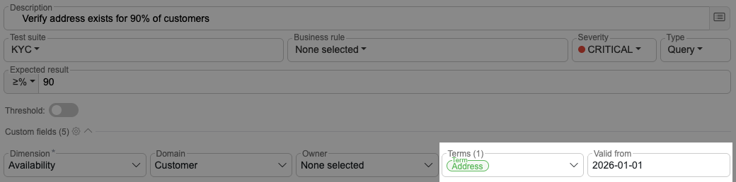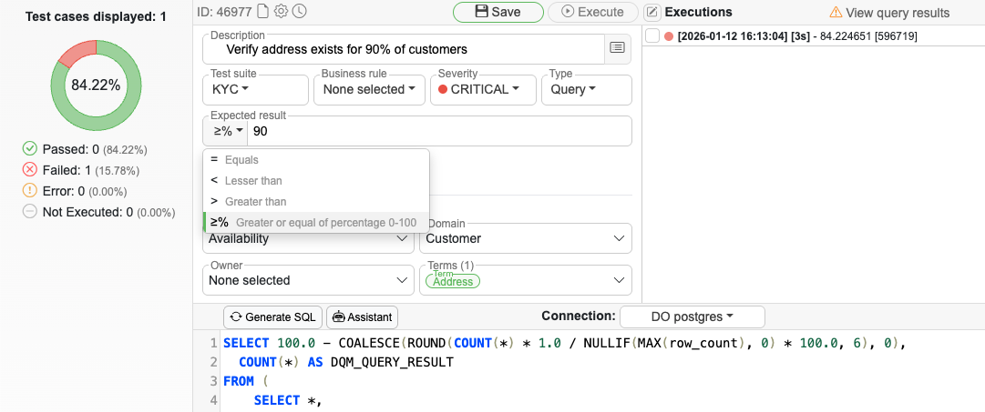 Test cases can now evaluate results against a percentage threshold instead of a strict pass or fail. The measured percentage is propagated across the platform and reflected in data quality metrics and dashboards. For example, a validation that checks whether at least 90% of rows meet a rule will display the actual percentage result in dashboard visualizations.