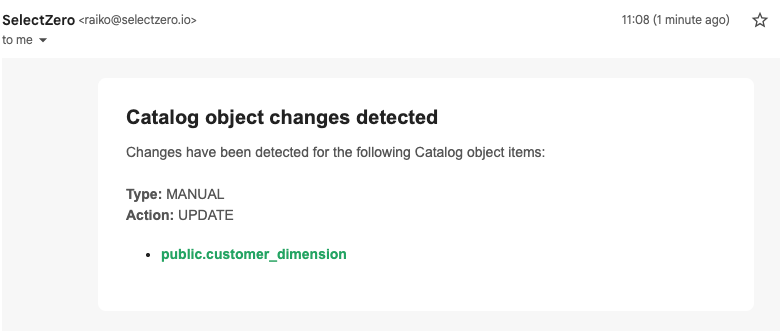 Users can configure automatic notifications for changes to specific Glossary terms or Catalog objects, such as schema drift. Alerts are delivered by email and include direct links to the affected entities, making it easy to review changes as they happen.